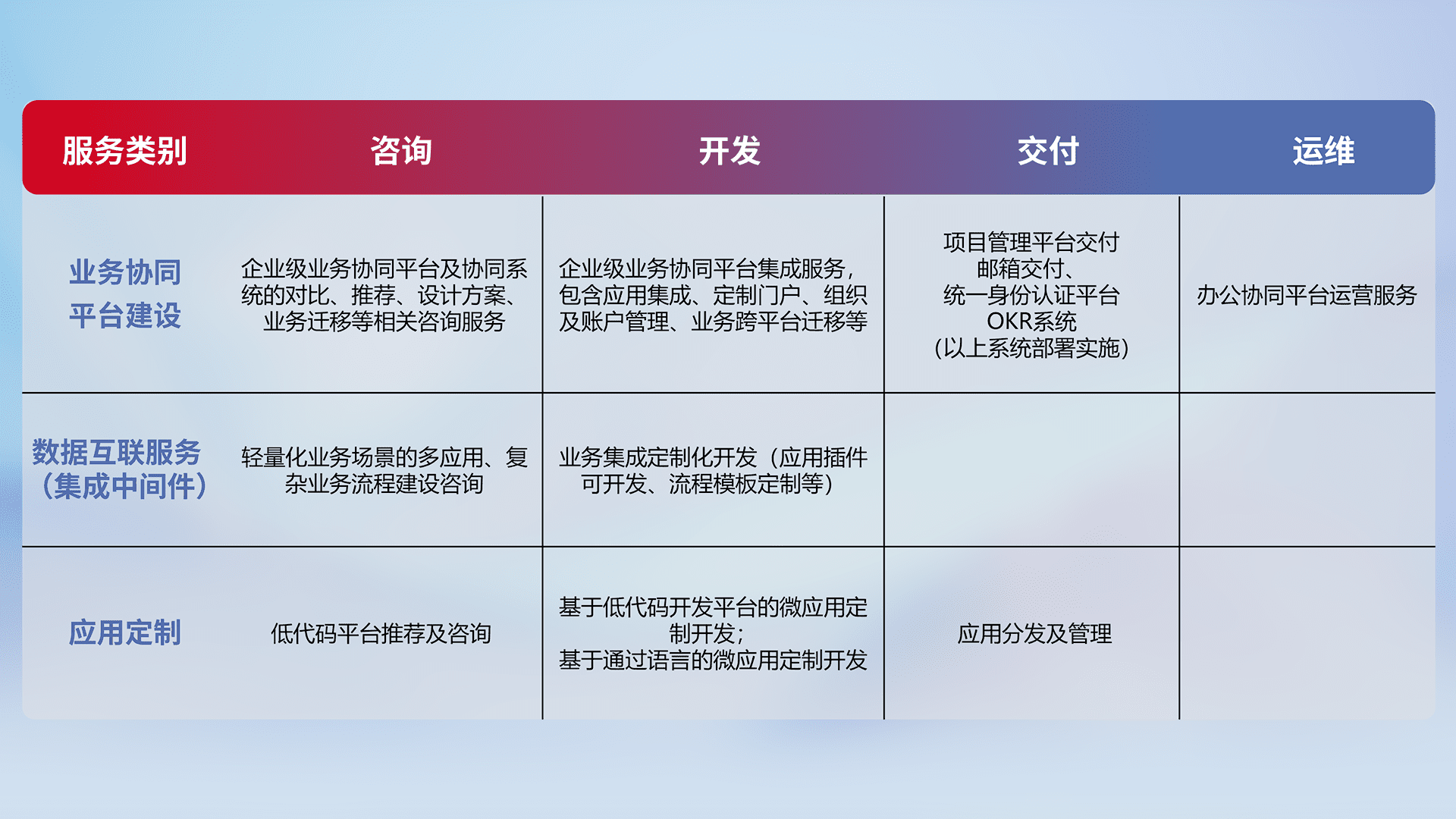 针对钉钉、、企微、、、IDaas等平台级产品提供产品的规划、、、方案、、交付、、、定制化开发等服务,,,实现如统一协同办公、、、、智能客户服务、、混合会议管理、、、、智能数据查询、、等业务场景,,实现数字化转型。。。。