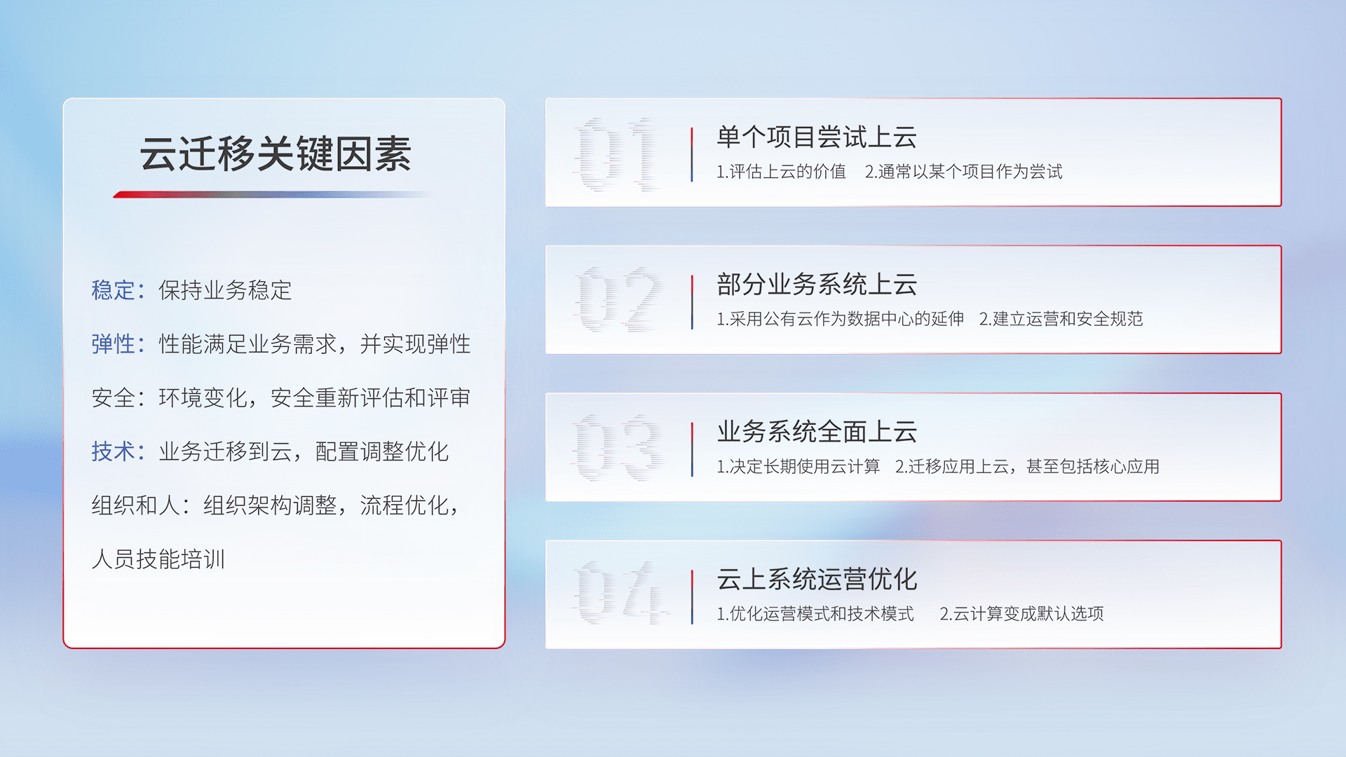 结合实际业务,,,从规划设计、、云平台选型、、、、云原生改造、、、数据迁移、、、、集成交付,,,迁移全过程为客户识别最佳上云路径,,做好风险识别管理,,设计网络架构、、、、身份权限、、、、安全审计合规、、、操作审计、、、日志审计、、、、监控告警策略、、、多站点容灾设计等,,,对云上基础设施进行整体规划,,提升IT治理水平,,以满足弹性、、高可用、、、、高性能的需求。。。。